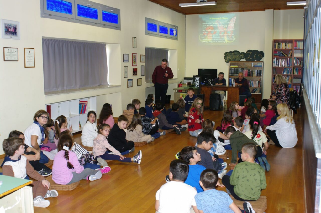 Ο συγγραφέας παρουσίασε στους μαθητές της Β΄ Τάξης το βιβλίο του “Η λίμνη με τα μαργαριτάρια: Η αρχή μιας φιλίας” από τις Εκδόσεις «Χάρτινοι Ήρωες». Τα παιδιά συνοδεύονταν από τις δασκάλες τους, Γατσή Ρούλα και Τσαρέ Φωτεινή. Με τον ζεστό και παραστατικό του λόγο, ο αγαπημένος συγγραφέας ταξίδεψε τους μικρούς αναγνώστες σε έναν μαγικό, φωτεινό κόσμο γεμάτο φαντασία, περιπέτεια και μηνύματα φιλίας.