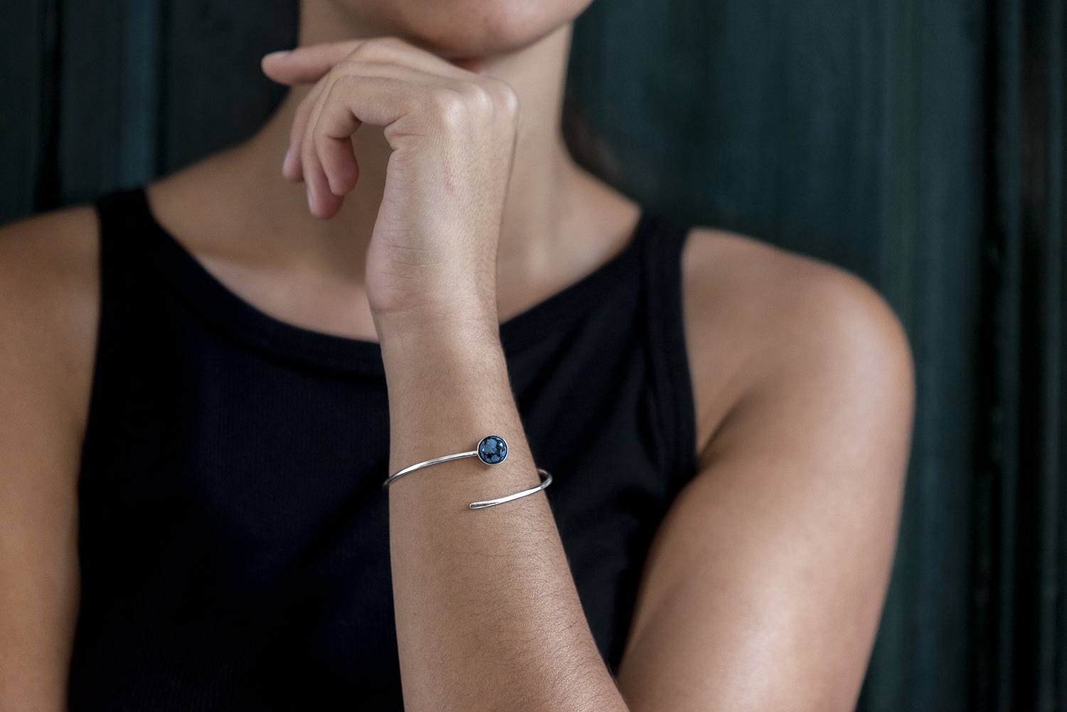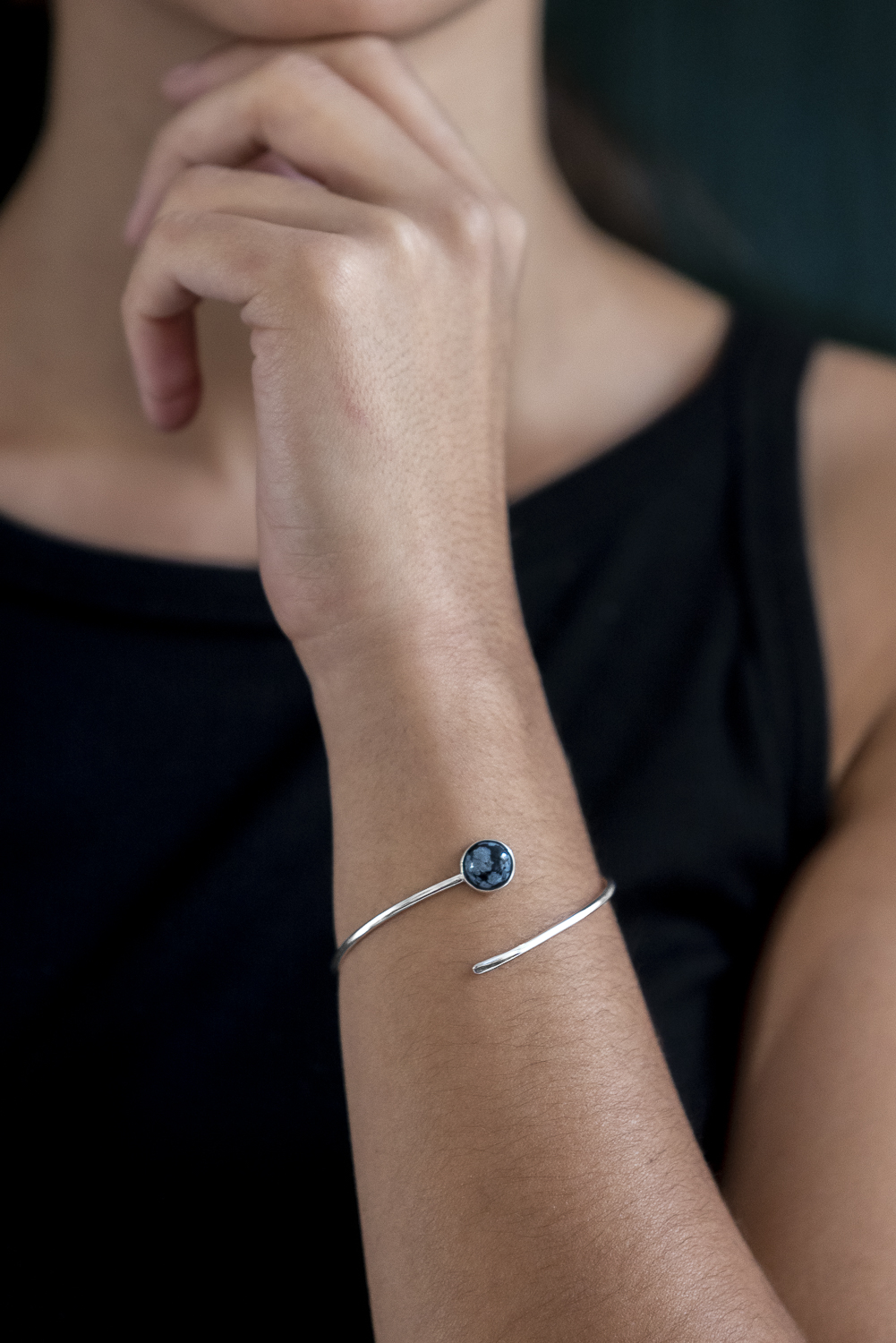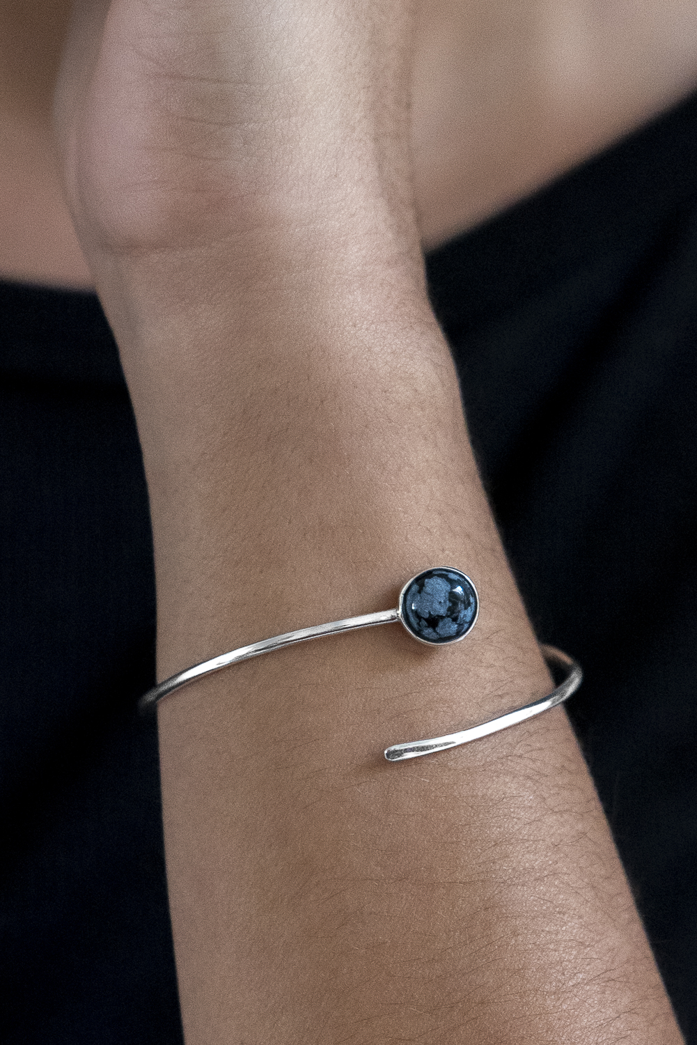 Το Aurora είναι ένα ανοιχτό cuff βραχιόλι από ασήμι 925, ελαφρύ και ευέλικτο. Προσαρμόζεται ελαφρώς στον καρπό χάρη στην ανοιχτή του κατασκευή, χωρίς να χάνει τη σταθερότητα και την κομψότητά του. Στην άκρη υπάρχει στρογγυλή χιονονιφάδα οψιδιανού, μια ηφαιστειακής προέλευσης πέτρα, που συνδέεται με την προστασία και τη γείωση — δίνοντας στο βραχιόλι όχι μόνο αισθητική, αλλά και ενεργειακή αξία.